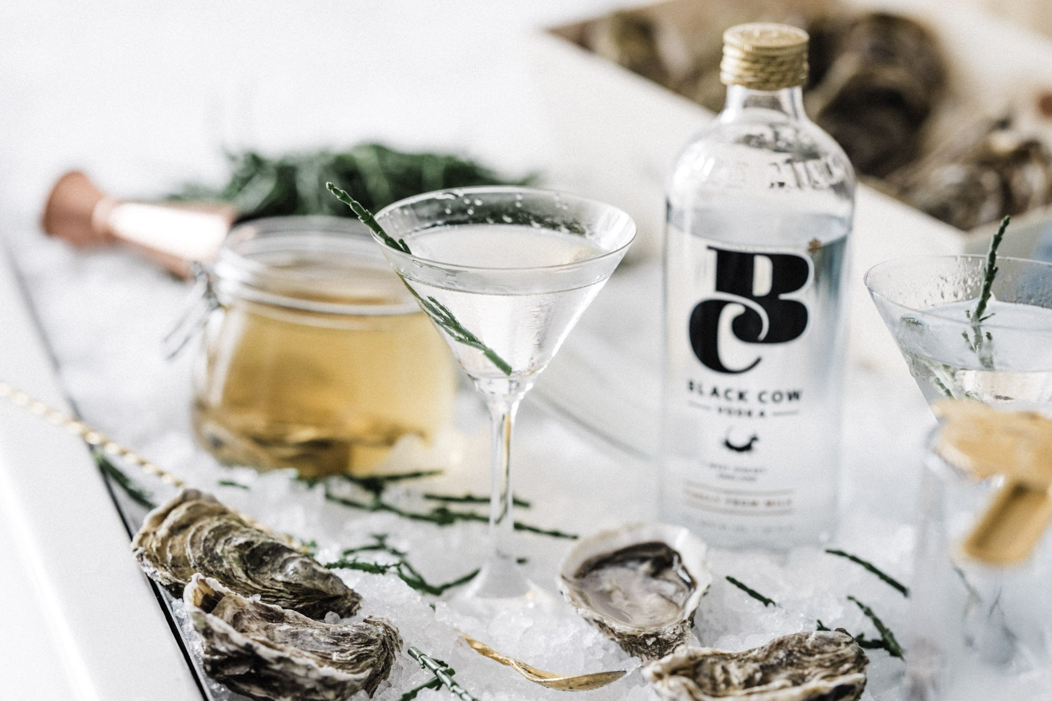A martini inspired by the Dorset coast. Black Cow Vodka is stirred with oyster shell, infused vermouth and finished with fresh samphire.