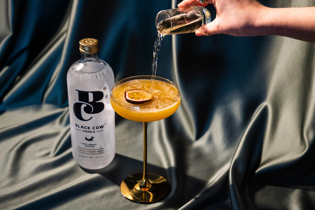 A lively Pornstar Martini with Black Cow Vodka, passion fruit and vanilla, finished with a sparkling wine sidecar.