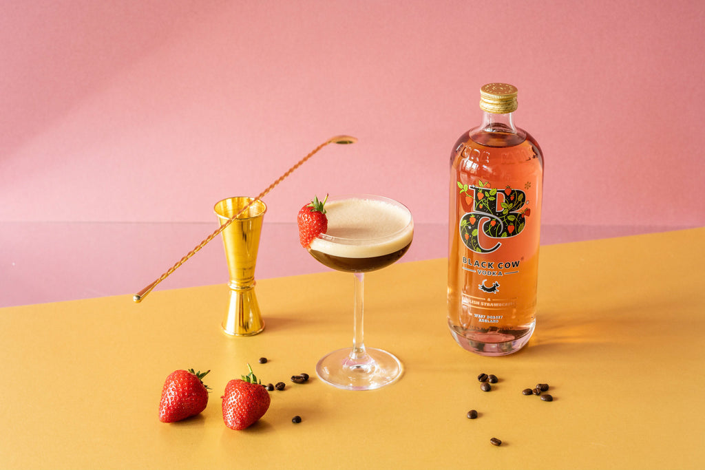 A strawberry-led Espresso Martini made with Black Cow & English Strawberries, coffee liqueur and fresh espresso.
