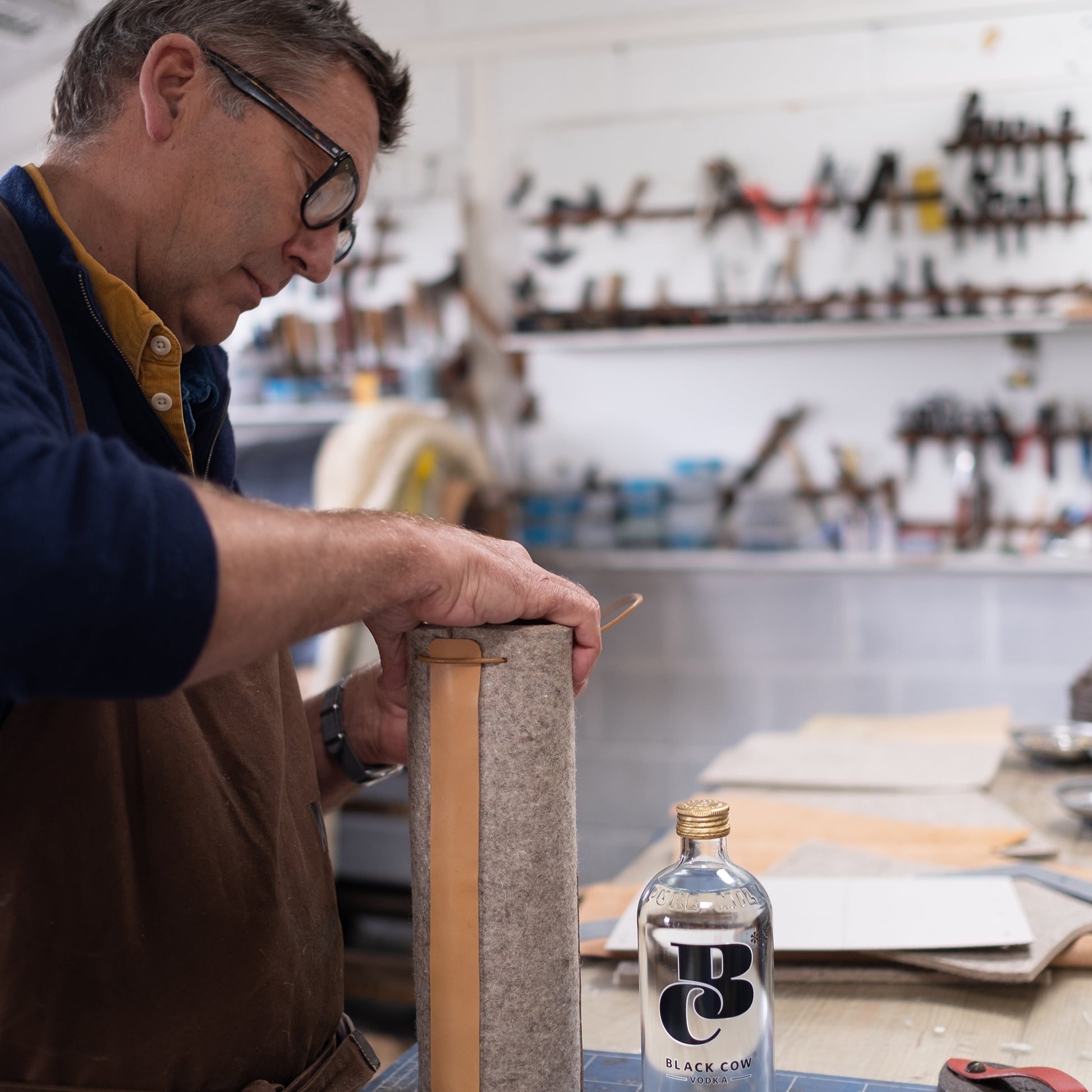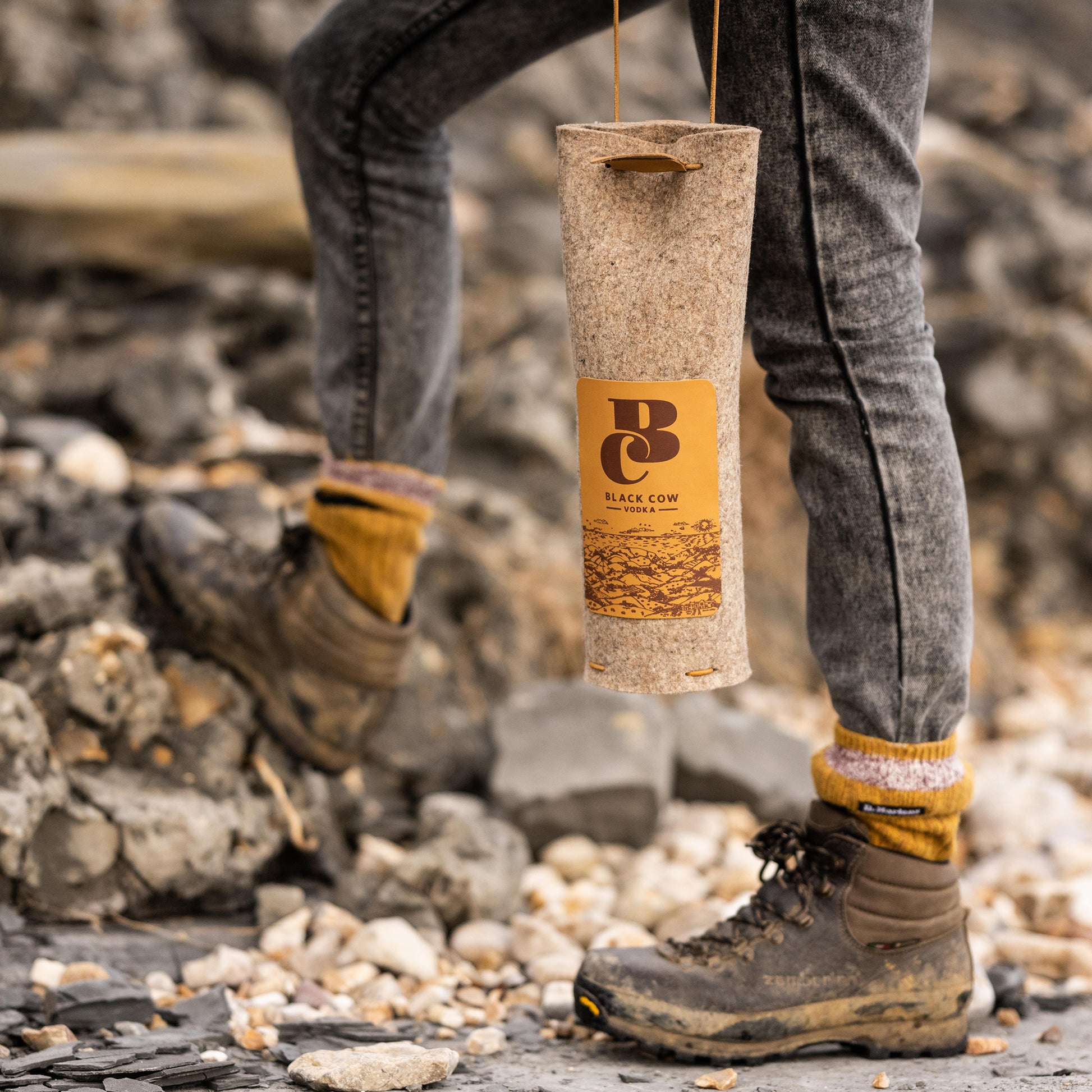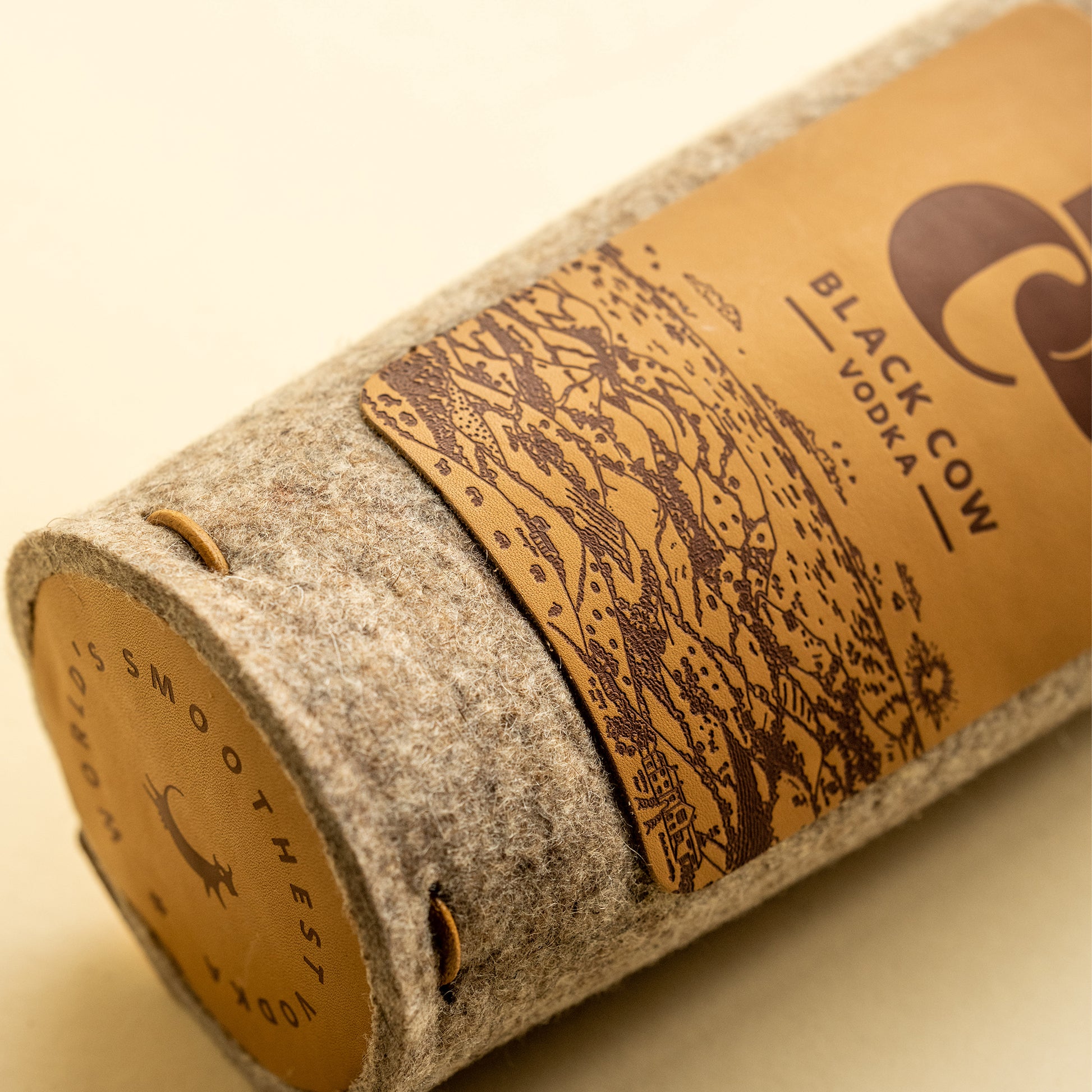 Made with textured, natural wool-felt and vegetable-tanned leather with Black Cow detailing, the carrier is designed to hold a bottle of Black Cow and a small truckle of Black Cow Deluxe Cheddar. A circular divider, made from a composite of the felt and leather, protects and separates the cheese from the vodka.