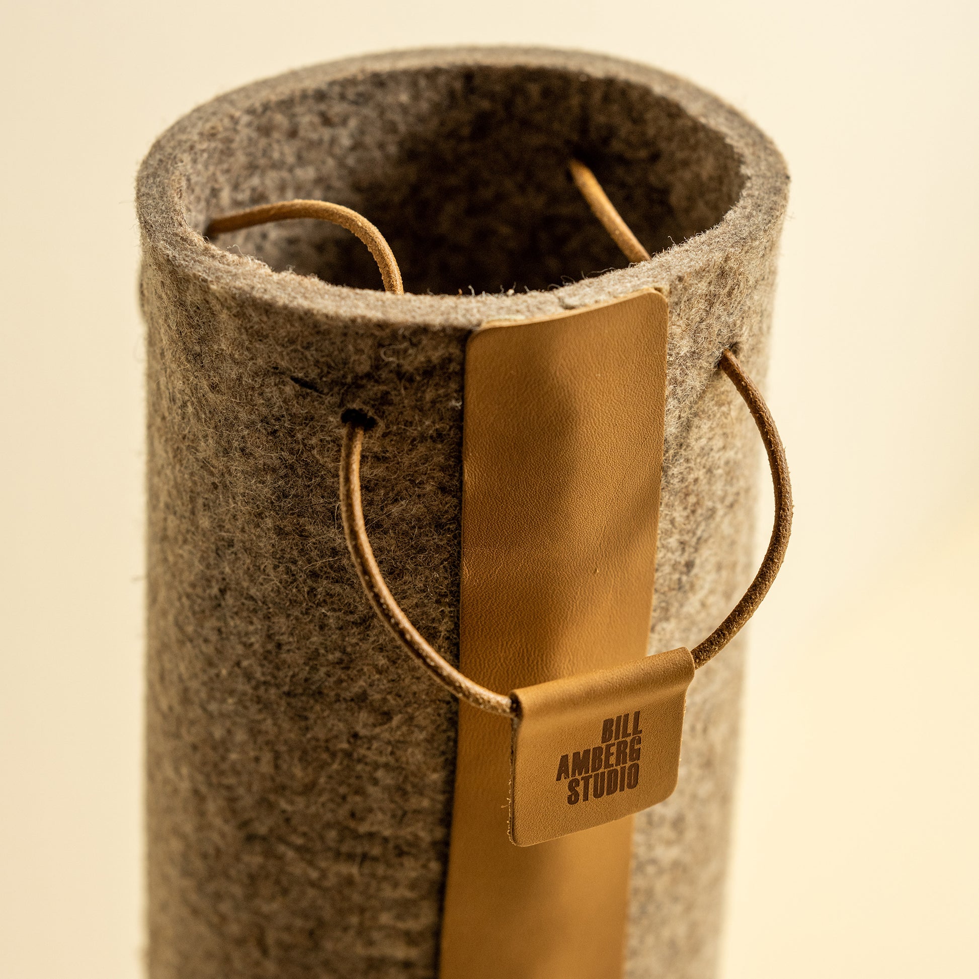 The materials used to make the carrier have been chosen for their durable and functional properties, as well as their sustainable qualities. The wool-felt is made using waste wool from the fashion industry. It is a natural insulator, keeping things either hot or cold by absorbing the moisture in the air. This particular leather is a remnant from the shoe-making industry. It ages beautifully, subtly patinating and changing character over time.
